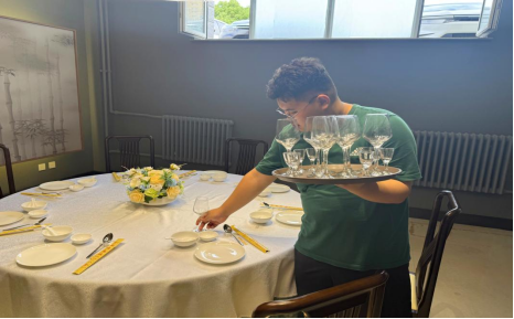 中餐宴会摆台项目同样精彩纷呈。同学们动作娴熟,从餐具的摆放顺序到间距控制,从台布的铺设到装饰品的点缀,每一个步骤都一丝不苟。洁白的台布平整如镜,精致的餐具排列整齐,精美的装饰品为整个台面增添了艺术气息。他们将所学的专业知识与技能完美融合,打造出一个个兼具实用性与观赏性的宴会场景。