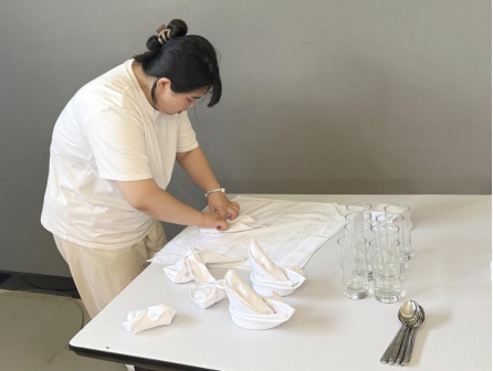 随着考试的开始,同学们依次进入考试区。本次考试项目为餐巾折花和中餐宴会摆台,这两个项目不仅考验同学们的动手能力,更对细节把控、审美能力有着极高的要求。在餐巾折花环节,同学们动作娴熟,从容自信。