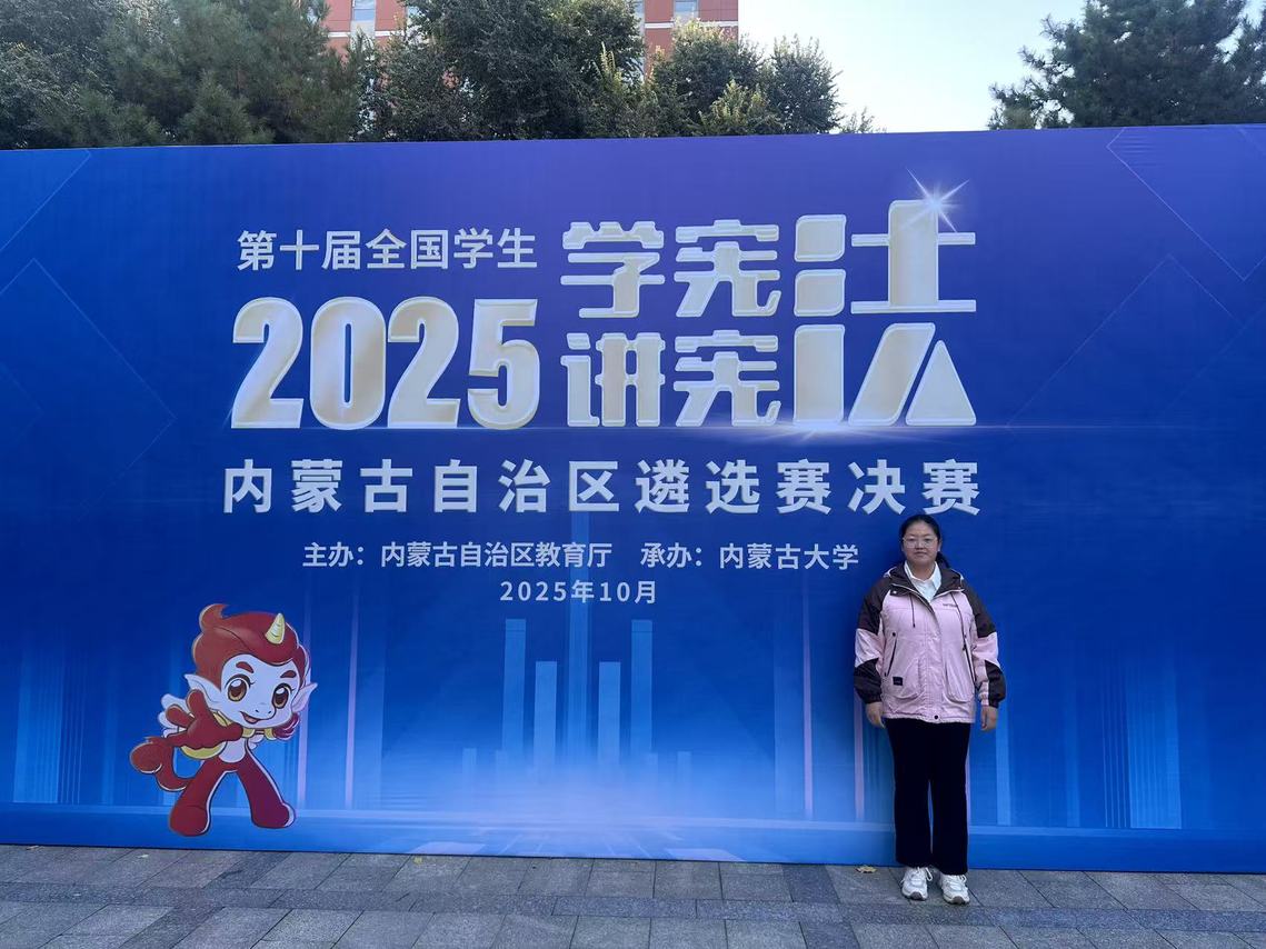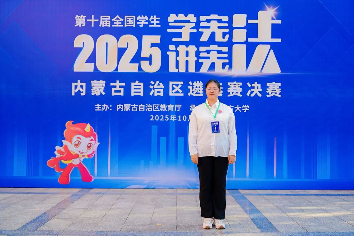 2025年10月19日,在呼和浩特内蒙古大学举行的2025年第十届学宪法讲宪法活动内蒙古自治区遴选赛决赛中,来自我院轻工化工系24级药品生产技术1班的张雨杰同学获得高校组法治素养赛项第三名并荣获三等奖,周洋老师荣获自治区级优秀指导教师,这也是我院在此项比赛中的最好成绩!